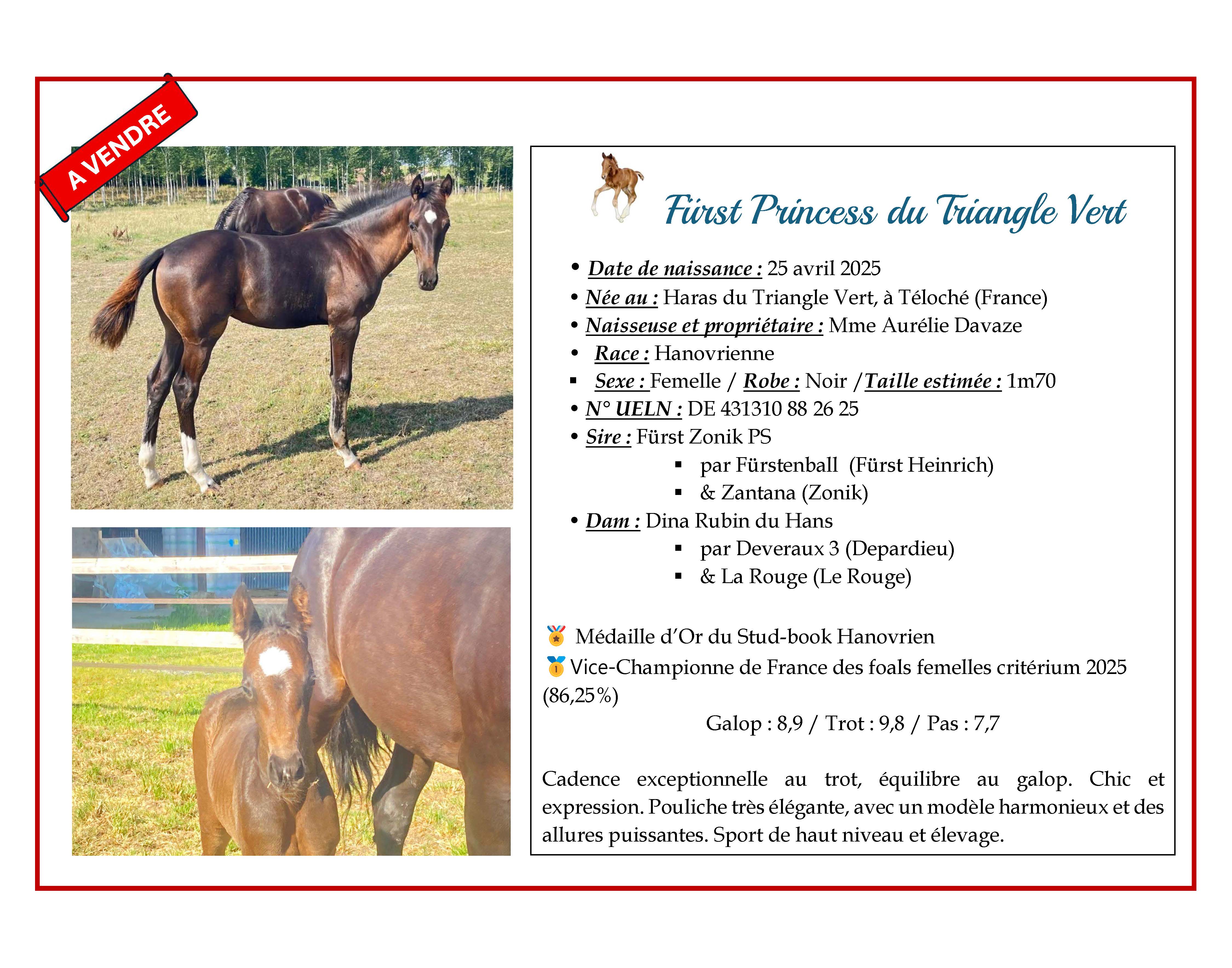 Née le 25 avril 2025, Fürst Princess du Triangle Vert est une pouliche Hanovrienne élégante et puissante, issue du croisement entre Fürst Zonik PS et Dina Rubin du Hans, par Deveraux 3. Elle allie chic, équilibre et locomotion, avec un modèle harmonieux et une expression raffinée.